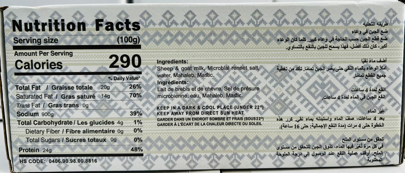 Soak the cheese in water for at least 24 hours to reduce saltiness, changing the water every 6 to 8 hours. Enjoy it fresh, fried, or baked in pastries and desserts. Ideal for mezze platters, traditional dishes, and Middle Eastern sweets like Kunafa.