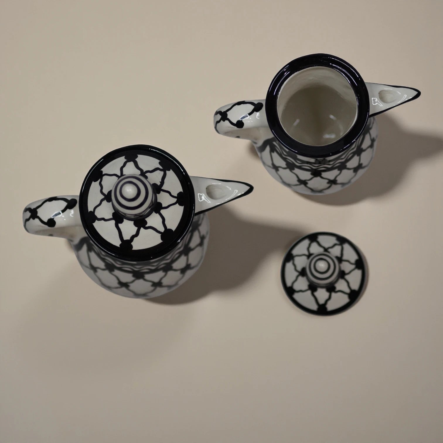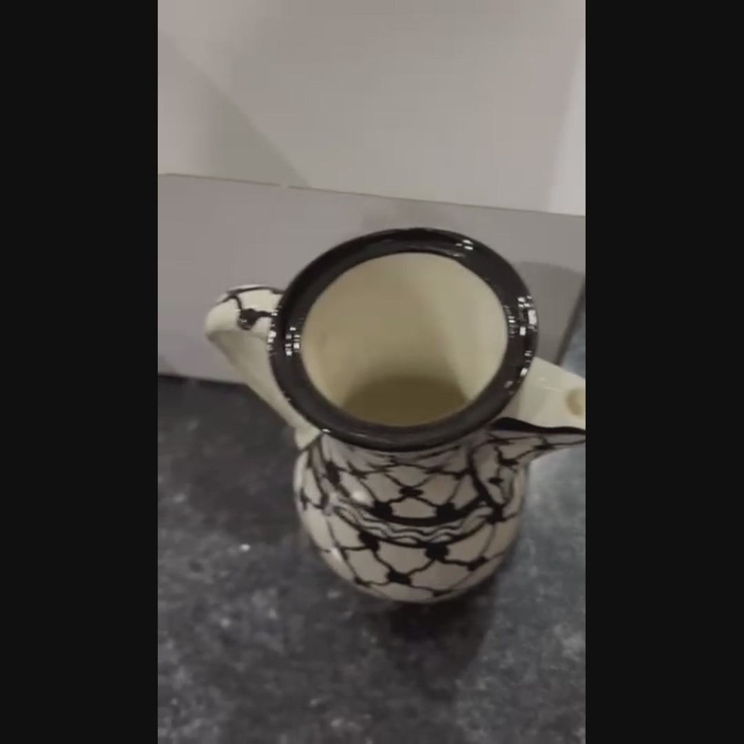 A handmade ceramic coffee jug inspired by Palestinian heritage. Available in unique hand-painted designs including Colored and Kuffia styles. Crafted by artisans using food-safe materials.