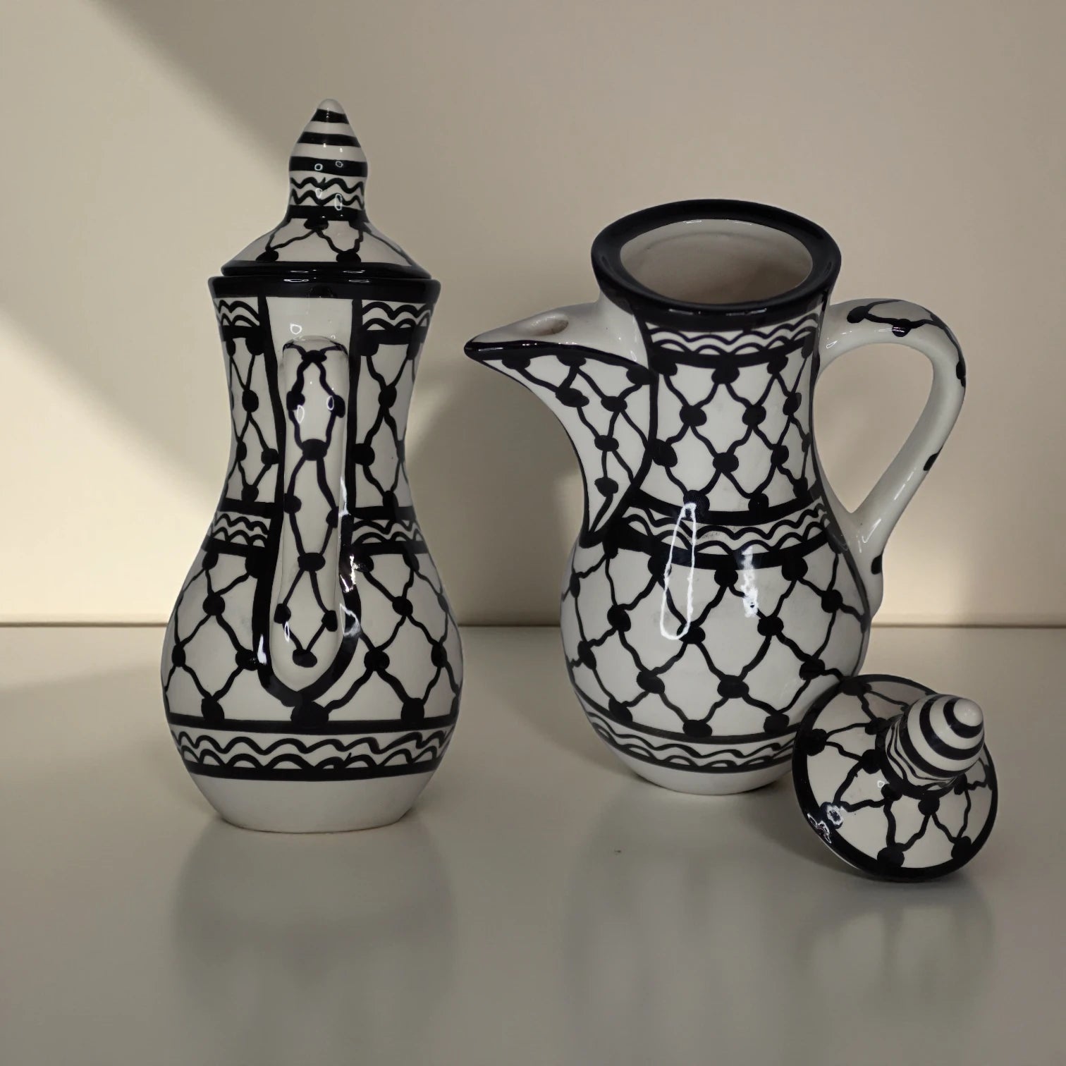 Bring the warmth of Palestinian culture into your home with this Handcrafted Ceramic Coffee Jug, a timeless piece that captures tradition, craftsmanship, and beauty in every detail. Each jug is skillfully shaped and hand-painted by Palestinian artisans, available in two exquisite styles: Colored Design and the iconic Kuffia Pattern. Designed for both functionality and display, this piece adds cultural depth to your coffee rituals and home décor.