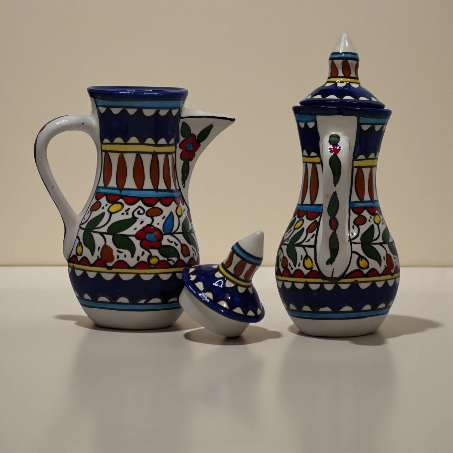 Every Palestinian coffee jug is handcrafted in small artisan workshops using natural clay and traditional ceramic-making techniques. The process begins with the careful shaping of the jug, followed by hand-painting using natural, lead-free pigments. Each design reflects symbols deeply rooted in Palestinian culture — from the geometric Kuffia pattern that signifies resilience and unity to the colorful floral motifs inspired by the beauty of the land.