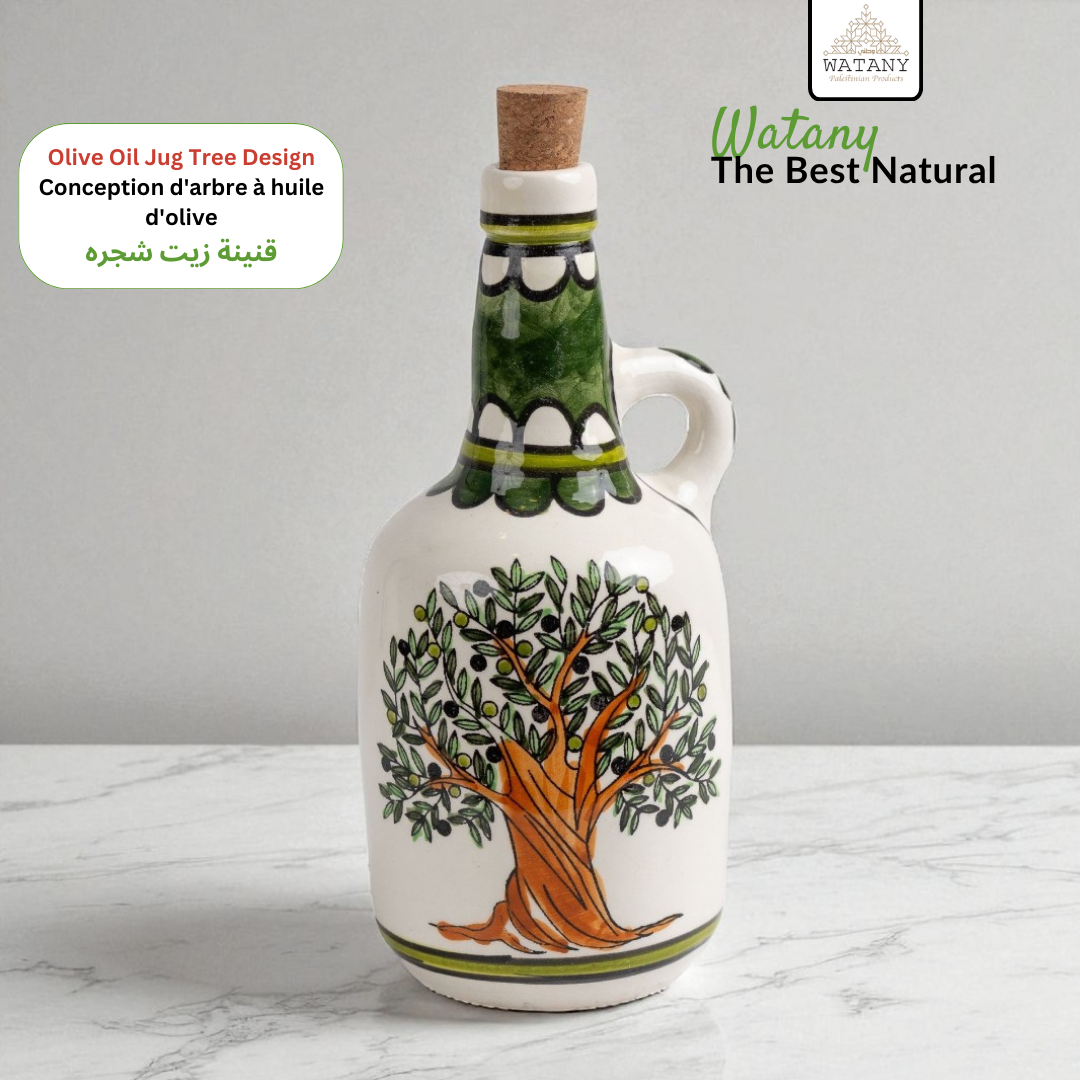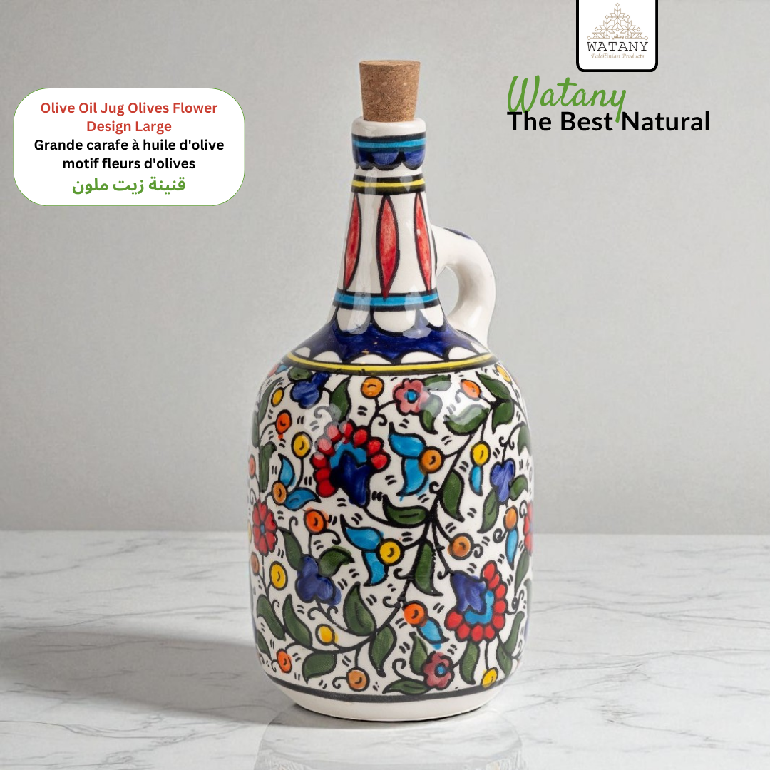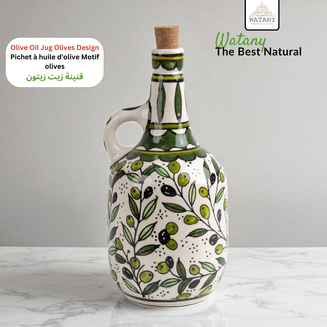 Handcrafted ceramic olive oil dispenser by Palestinian artisans, featuring beautiful hand-painted Olives and Flower designs. Durable glazed finish with an ergonomic handle for precise pouring.