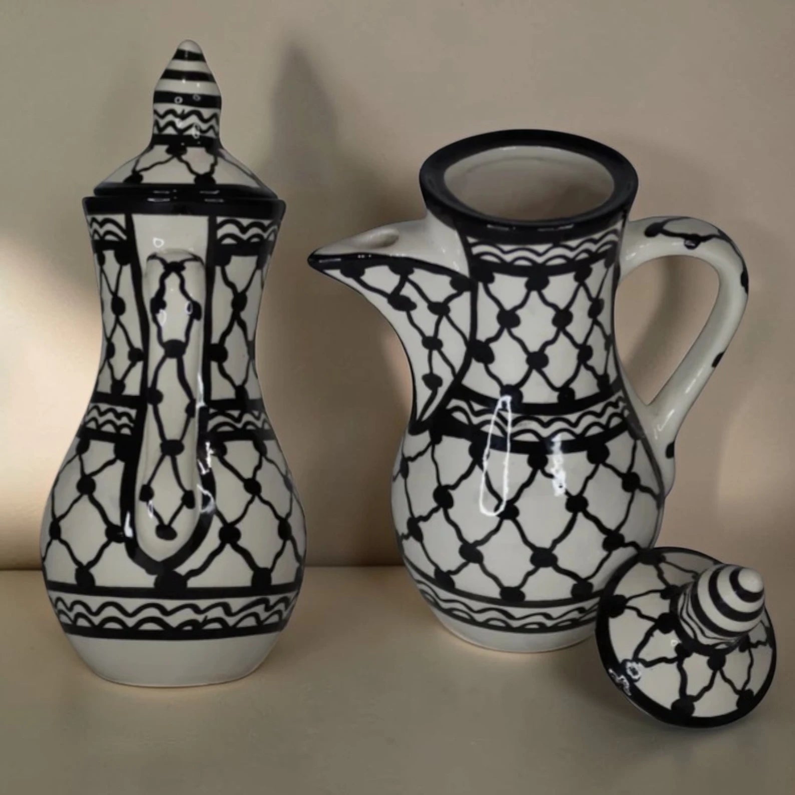 A handcrafted ceramic coffee set inspired by Palestinian heritage, featuring the iconic keffiyeh design. Perfect for serving Arabic, Turkish, or everyday coffee with style.