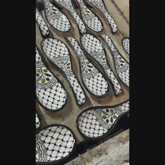 Each spoon rest is shaped and hand-painted by skilled ceramic artists using traditional techniques native to Hebron and Jerusalem. The process involves multiple stages of firing and glazing to achieve durability and a glossy finish while preserving vibrant colors. The olive branch design represents peace and the land’s natural abundance; the kuffia pattern symbolizes resilience and heritage; and the floral design brings a modern, elegant twist to Palestinian artistry. Every brushstroke is unique, making each piece one-of-a-kind.