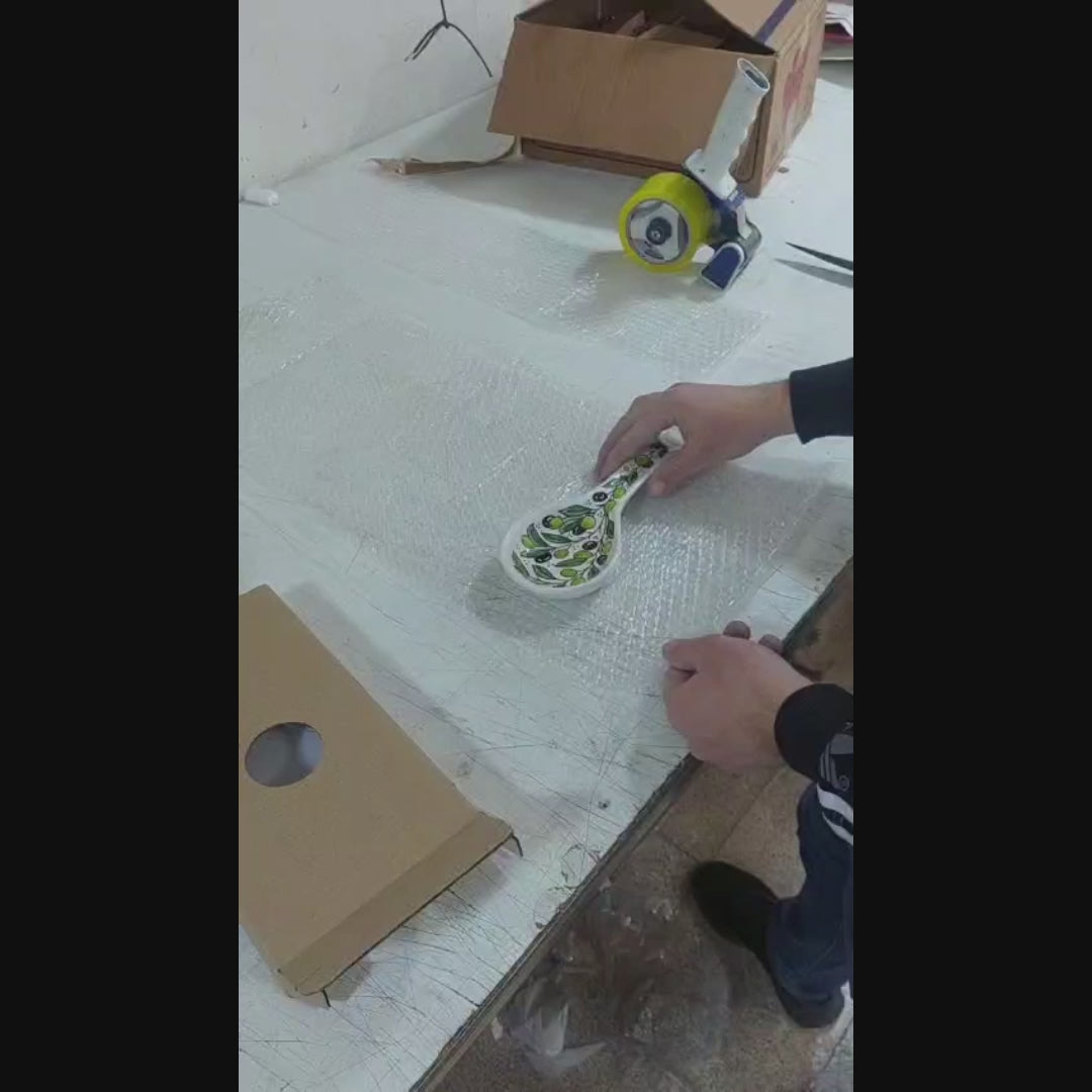 Each spoon rest is shaped and hand-painted by skilled ceramic artists using traditional techniques native to Hebron and Jerusalem. The process involves multiple stages of firing and glazing to achieve durability and a glossy finish while preserving vibrant colors. The olive branch design represents peace and the land’s natural abundance; the kuffia pattern symbolizes resilience and heritage; and the floral design brings a modern, elegant twist to Palestinian artistry. Every brushstroke is unique, making each piece one-of-a-kind.